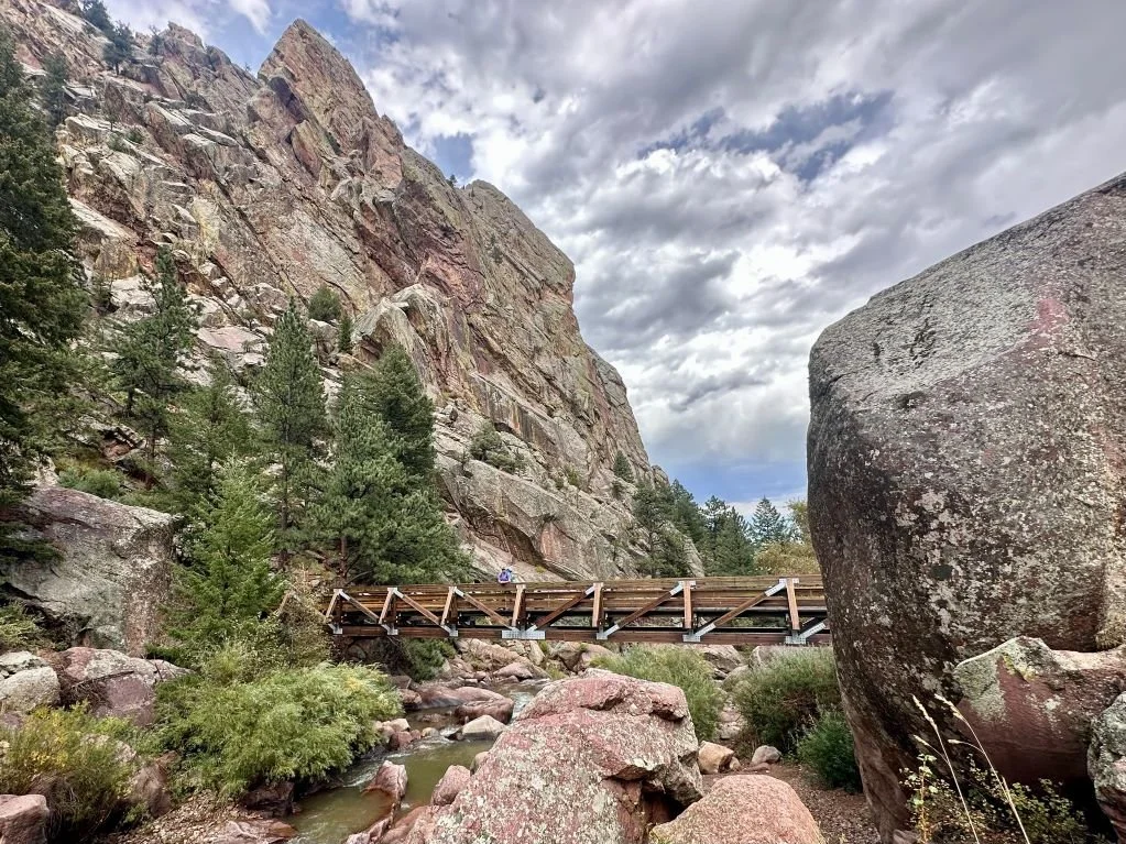 The new West Ridge Bridge in Eldorado Canyon State Park, with the Redgarden Wall behind it.